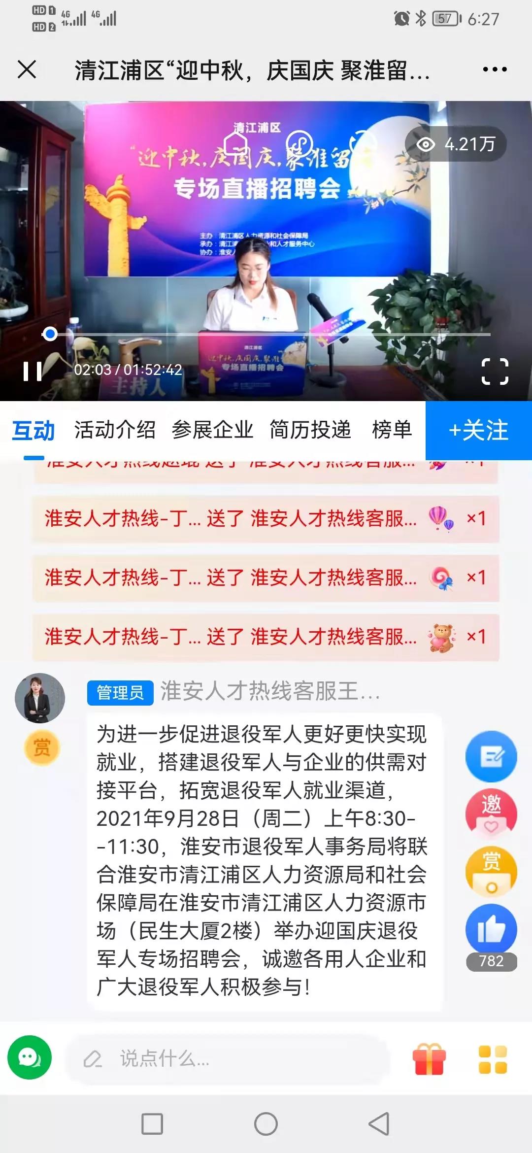 萬家團圓迎中秋,四海歡騰慶國慶。為慶祝偉大祖國72周年華誕,弘揚中華傳統(tǒng)佳節(jié)文化,同時打造服務大局、服務淮安就業(yè)的品牌工程,吸引廣大人才就業(yè)者的青睞,切實為我市廣大求職人才及企業(yè)搭建優(yōu)質交流平臺,拓寬就業(yè)渠道,為我市引進人才助力轉型發(fā)展提供智力支持。2021年9月17日清江浦區(qū)人力資源和社會保障局成功開展“迎中秋,慶國慶 聚淮留浦”專場直播招聘活動,參展企業(yè)11家,提供5000+招聘崗位,吸引了4.2萬+求職者觀看。