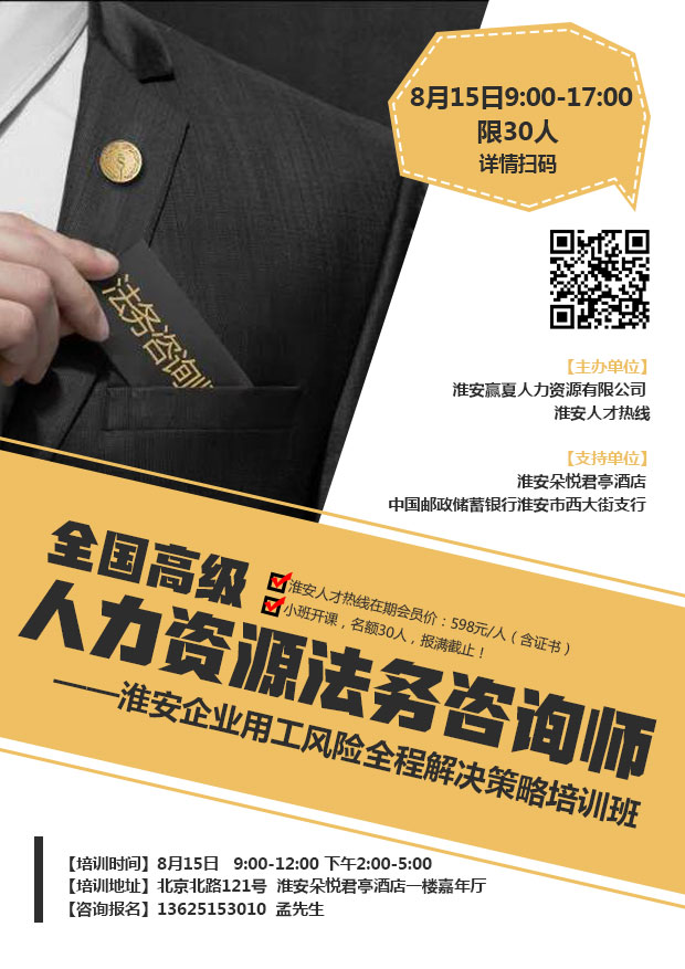 亡羊補牢,猶未為晚!讓我們走進系統(tǒng)學習的課堂——《全國高級人力資源法務(wù)咨詢師》研修班,掌握更多實戰(zhàn)技巧、消除諸多用工風險,切實幫助企業(yè)實現(xiàn)輕松用人,解決企業(yè)用工過程中的各類風險問題。