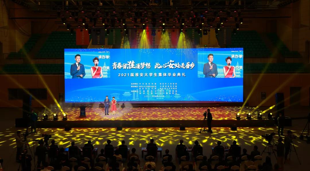 5月20日,2021屆淮安大學(xué)生集體畢業(yè)典禮在淮陰工學(xué)院枚乘路校區(qū)體育館舉行?;顒?dòng)以“青春留淮逐夢(mèng)想 此心安處是吾鄉(xiāng)”為主題,共分“淮”抱青春、“安”逐夢(mèng)想兩個(gè)篇章。中共淮安市委副書(shū)記、淮安市人民政府市長(zhǎng)陳之常,市委常委、組織部長(zhǎng)孫虎,市人大常委會(huì)副主任、黨組副書(shū)記劉華,市政府副市長(zhǎng)王紅紅,市政協(xié)副主席王莉莉,淮陰工學(xué)院黨委書(shū)記趙炳起,淮陰師范學(xué)院黨委書(shū)記朱漢清,淮陰工學(xué)院校長(zhǎng)孫愛(ài)武,江蘇財(cái)經(jīng)職業(yè)技術(shù)學(xué)院黨委書(shū)記韓香云、淮陰工學(xué)院副校長(zhǎng)朱曉文出席典禮。活動(dòng)現(xiàn)場(chǎng)通過(guò)線上方式向全市大學(xué)生進(jìn)行網(wǎng)絡(luò)直播。