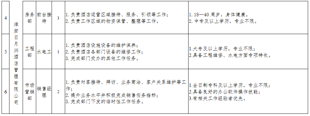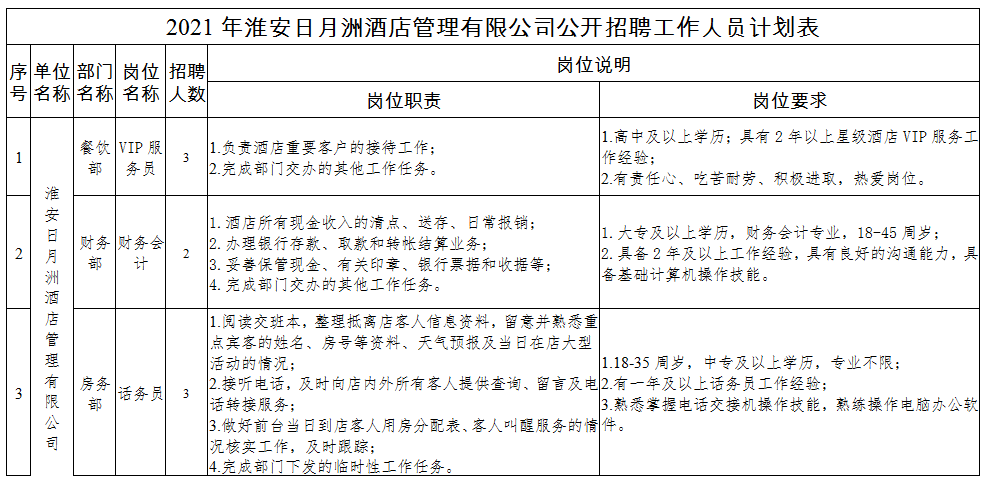 詳見《淮安日月洲酒店管理有限公司公開招聘工作人員計劃表》。